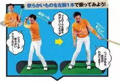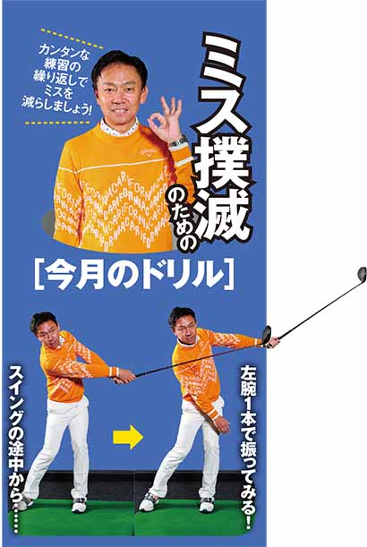 途中まではいつもどおりに素振りをして、インパクト以降で右手だけを離してみる。このとき、左腕は遠くへ伸ばすイメージで。左ワキを締める意識が強いと体がのけぞってしまう。あくまでもフォローでは体と腕を離す感覚を覚える!