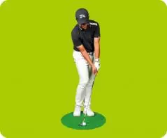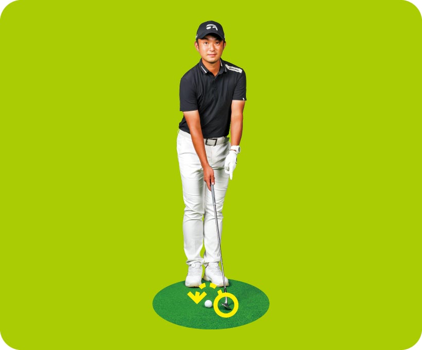 基本のアドレスよりも少しハンドファースト気味に構え、ボールを前に転がしてカップに寄せていくイメージでスイングする。