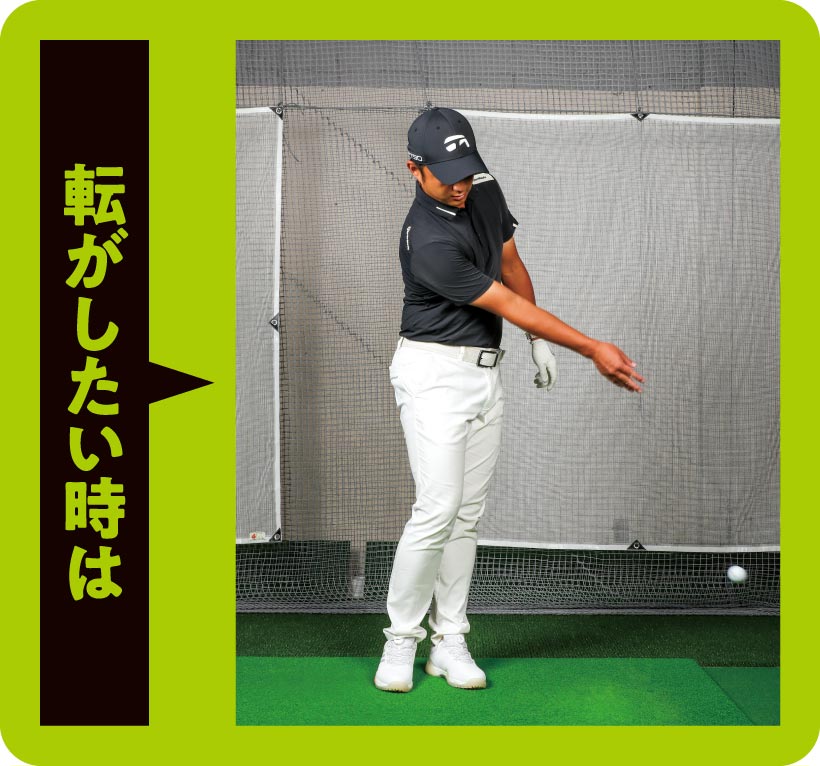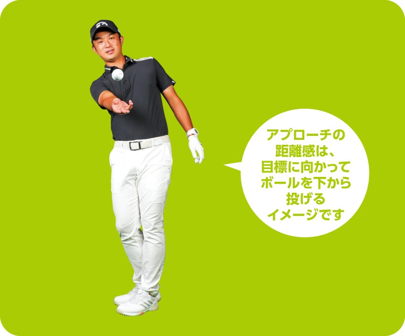 少しオープンに構えて、右手で目標にボールを投げるようにゆるやかにスイングする。キャリーとランの割合をしっかりイメージしよう。