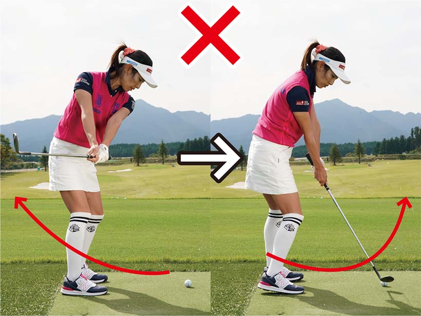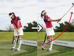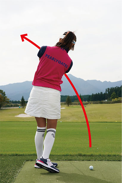 もう一つは目標よりもクラブを左に振り抜くこと。ヒッカケを怖がってクラブを目標に真っすぐや右に振り抜こうとするとフォロースルーで腕がカラダから離れてしまいます。これって結局は手打ちなんです。インサイド・アウト型の軌道で振っているのが原因でシャンクになる人は、軽いアウトサイド・インの軌道で振り抜いていく意識を持ちましょう。カラダの回転を使って振り抜いていく感覚をつかんで、シャンクを解消してくださいね。