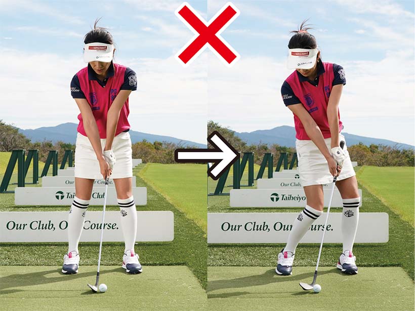 シャンクが出やすい人たちの話を聞くと、「クラブを目標の左に振るとヒッカケになってしまう」という認識がある方がとても多いんですね。それにスタンスが割と広くて、ボールから離れて立ちすぎる人もよく見ます。ボールから離れて構えるためテークバックでクラブをインサイドに低く引きすぎて、インパクトではカラダがボールに接近して結果的にネックに当たってしまうのです。