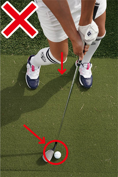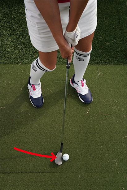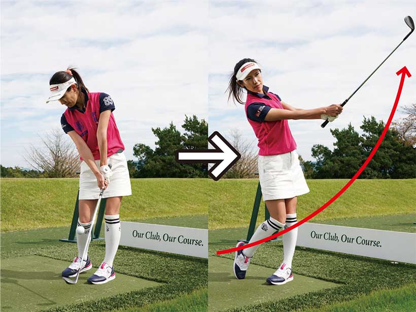 ボールの近くに立って構え、クラブを左に振り抜こう!