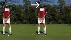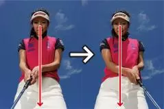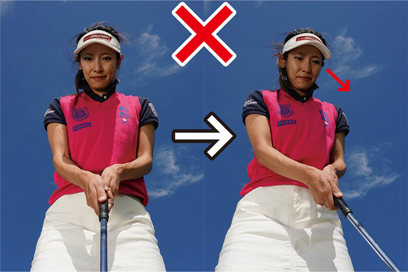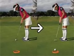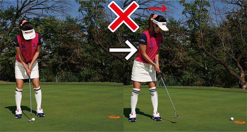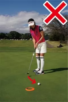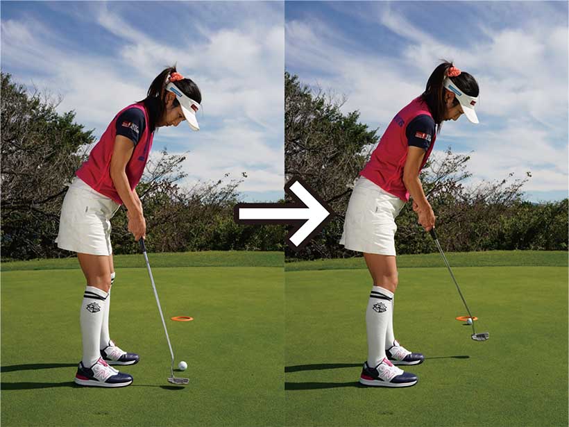 カップまでの距離が近いと構えたときにカップが視界に入りますよね。コレが曲者で、結果を早く見ようとしてインパクトで目がカップのほうを向きやすいんです。そうなるとインパクトの時点でフェースの向きやストロークの軌道にブレが生じてしまいます。上体が突っ込むとフェースがかぶって当たり、カップの左に外しやすくなります。そっと当てようとしてインパクトが緩むとフェースが開きやすく、カップの右に外してしまいます。
