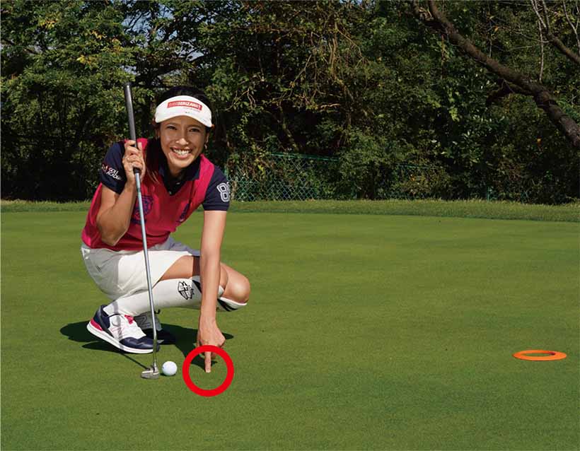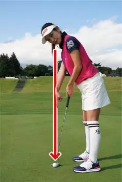 ショートパットが入る回数が増えれば、スコアだってすぐによくなります。10メートルのロングパットはカップ周りの1メートル圏内に寄ってセカンドパットでイン。そんなプレーができるようになると最高ですよね。もしショートパットが思うように入らないとしたら、ボールの位置をチェックしてみてください。ボールから離れて構えたり、ボールの近くに立ちすぎたりしてはパターを真っすぐ振るのが難しいんです。ボールの位置は左目の真下がベストポジション。構えたときにボールが見やすくて、真っすぐのイメージが浮かびやすくなります。調子が悪くなったときのチェックポイントとして覚えておいてくださいね。