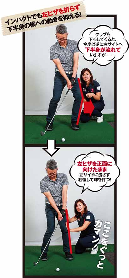 インパクトでも左ヒザを折らず下半身の横への動きを抑える!