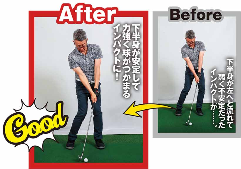 下半身が左へと流れて弱く不安定だったインパクトが……。