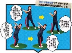 クラブを持たず、テークバックで右ヒザを伸ばし、左ヒザを前へ。フォロースルーでは逆に、左ヒザを伸ばして右ヒザを前に。その場で足踏みをするかのように動かしてみることで、下半身を横に流さない動作を覚えられますよ!