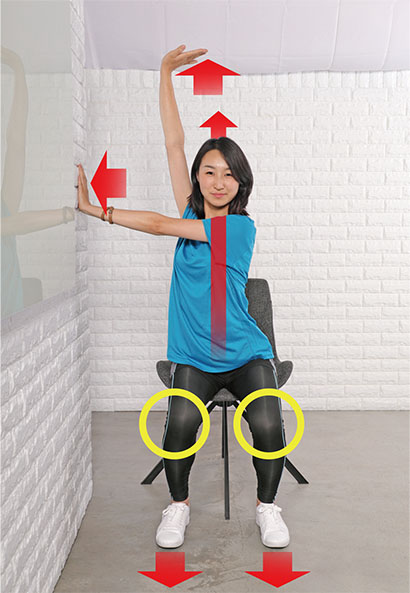 詳細は以下で説明しますが、椅子に座って背筋を真っすぐ伸ばし、頭が引っ張られているように姿勢を整えます。お腹とお尻の筋肉で骨盤をしっかり支えながら、片方の腕は天井を支えるよう真上に上げ、もう片方の腕は反対側にある壁を押して真横に伸ばします。肩まわりの動きが悪い人はこれだけでも重労働ですが、まだ完成していません。