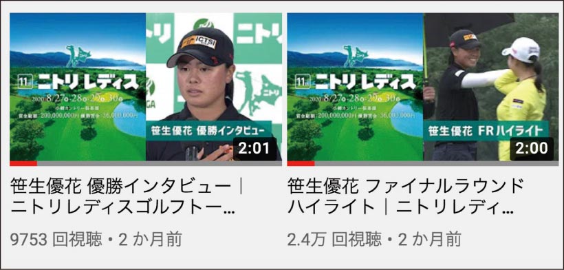「アース・モンダミンカップ」以外のトーナメントでも、早朝から競技終了までの長時間のネットライブ配信は数多くの試合で実施された。例えば今年注目を集めた笹生優花選手が2戦連続優勝を飾った8月下旬に開催された「ニトリレディス」も、アーカイブでライブ配信をされた動画が今も視聴できる。さらに、笹生選手の各日のプレー内容や優勝インタビューを約2分にまとめた動画など、アーカイブとして振り返りやすい映像も豊富にアップしてくれている。