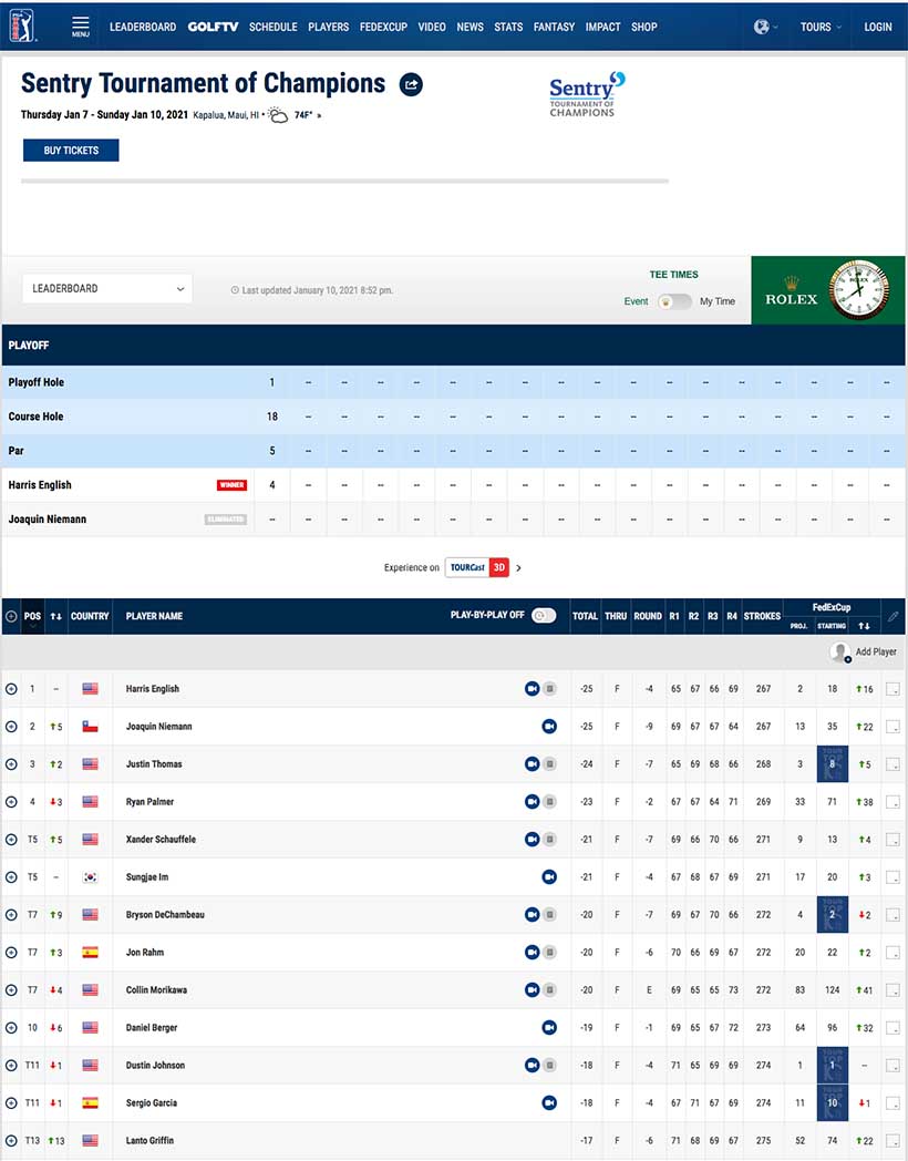 セントリー・トーナメント・オブ・チャピオンズ最終日はイングリッシュ、ライアン・パーマーの最終組が伸び悩み、後続が追い上げる展開となった。中でも5打差7位にいたニーマンがバーディラッシュをみせて25アンダーの単独首位でホールアウト。通算2勝目にグッと近づいた。