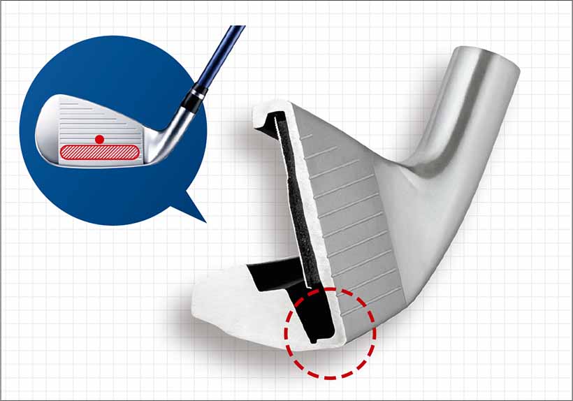 もともと構造的に「慣性モーメント」を大きくできないアイアンのほうが、「反発性能」でスイートエリアを広げられる可能性は大きい。近年のボックスキャビティ、アンダーカットキャビティ構造などは、深重心化だけでなく、フェース下寄りの「反発性能」を上げることにもつながっている。フェースの薄肉部をより下方向に広げることで、薄めの当たりに強くなっているのだ。ユニークなのは、テーラーメイドの『SIM』。ヘッド自体ではルール不適合なレベルまで高反発に仕上げ、最後にジェルを流し込んで適合値まで下げている。これならルール上限ギリギリを狙えるという。