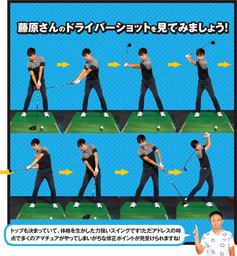 トップも決まっていて、体格を生かした力強いスイングです!ただアドレスの時点で多くのアマチュアがやってしまいがちな修正ポイントが見受けられますね!(鳥井悠治プロ)