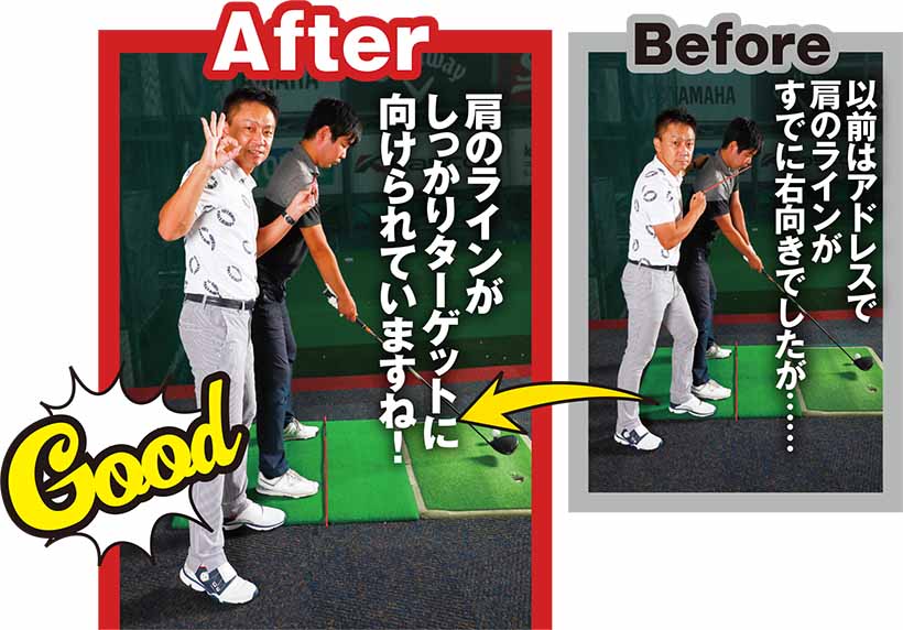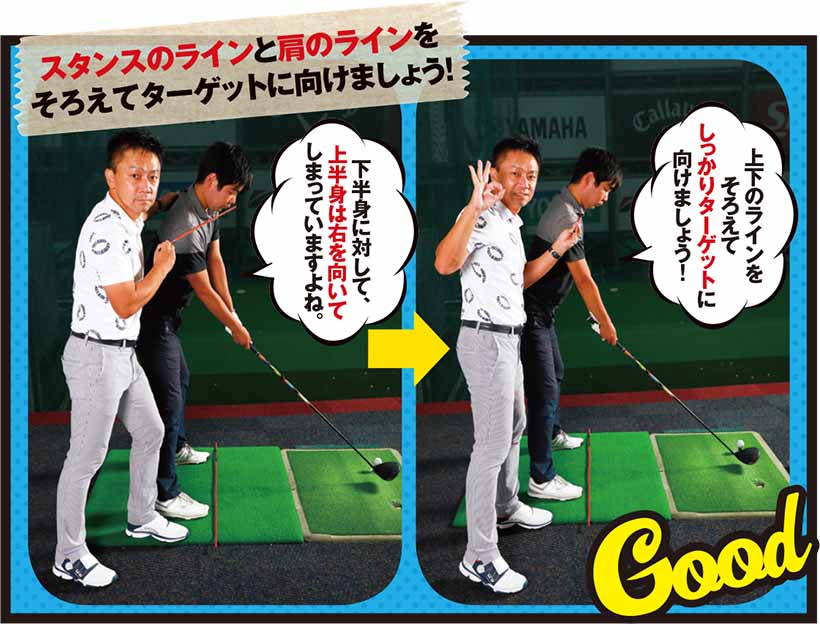 スタンスのラインだけをターゲットに向けてしまうことで上半身の肩のラインは右を向いてしまっていた! すると左肩が詰まったスイングになりプッシュアウトなどのミスが出ていた。