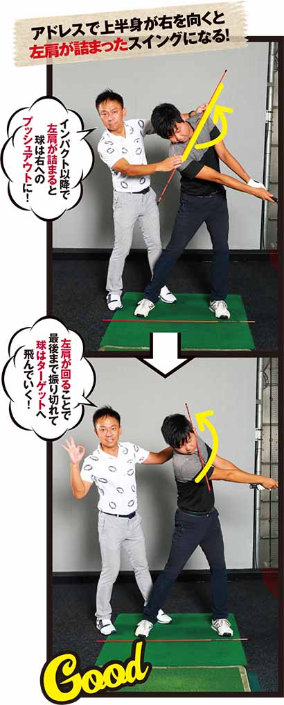 アドレスで上半身が右を向くと左肩が詰まったスイングになる!
