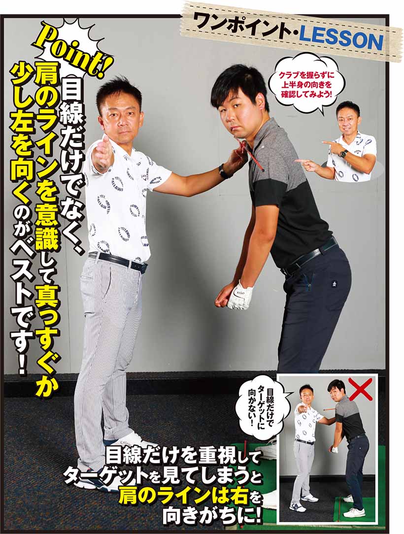 目線だけでなく、肩のラインを意識して真っすぐか少し左を向くのがベストです! 目線だけを重視してターゲットを見てしまうと肩のラインは右を向きがちに!