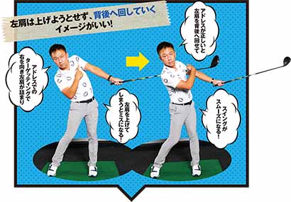 左肩は上げようとせず、背後へ回していくイメージがいい!
