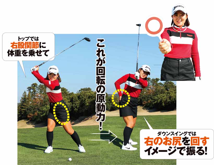 右のお尻を回転させると体とクラブが一緒に回転できる