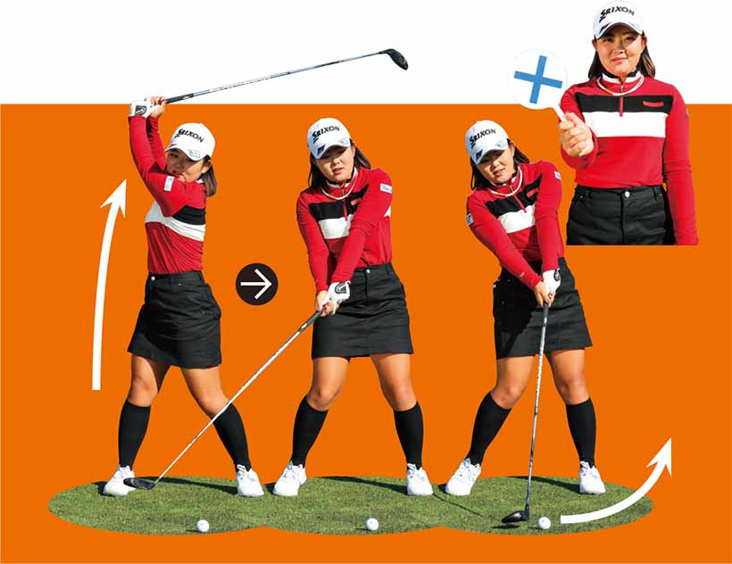 トップで体が伸び上がると、そこから高い球を打とうとして手だけのアッパー軌道になり、これがミスに繋がってしまう。
