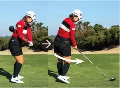 なので、体の回転力をスイングに生かすために、トップでは右の股関節に体重を乗せ、ダウンスイングからは右のお尻をその場で回転させる意識を持っています。体重移動をせずにスイングすると手元が詰まって、体が伸び上がってしまい手先で煽るようなスイング軌道になってしまいます。それだと、インパクトが安定しなくなり、トップやダフリなどの大きなミスに繋がってしまうので、体を回転させるために、体重移動は必須なのです。