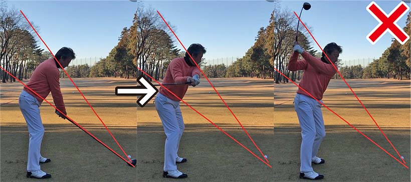 ヘッドを内側に引くことなく真っすぐ後ろへ動かすには、このくらい意識してヘッドを外側にキープする必要がある、ということを体感&実感してください。手元とヘッドの位置関係をキープしたまま、手が腰の高さにくるまで上げることができればオッケーです。