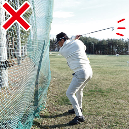 壁やネットなど垂直な面の前に立ち、その面にヘッドの先を合わせてアドレスします。その状態から、ヘッドがずっと壁やネットから離れないようにバックスイングするだけでOK!