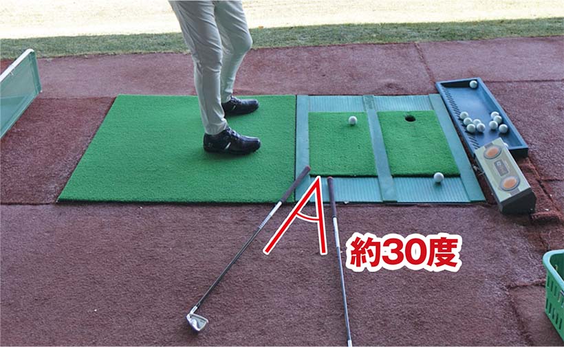 Vol.2のテークバックでは、クラブを平行に2本置いて手とクラブの位置関係を確認しましたが、ダウンスイングはちょっと違います。1本はスタンスと平行に置き、もう1本は斜め後ろ(30度程度)を向けてセットします。