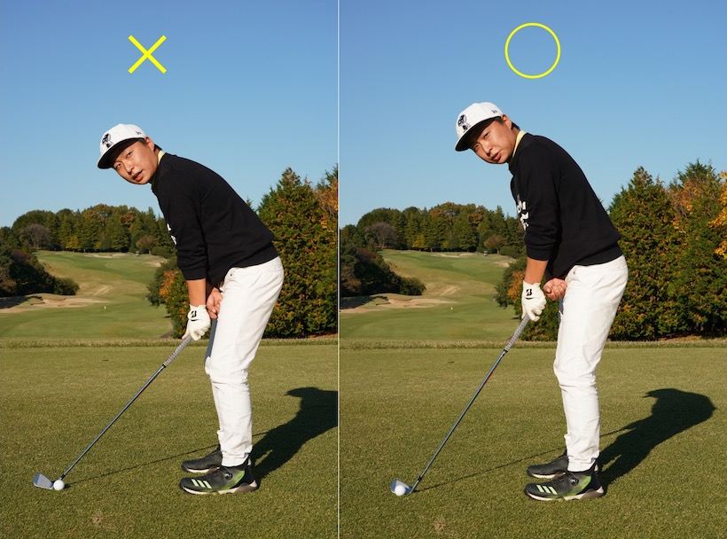 ×(写真左):体を前に倒しすぎて手が下がるとヘッドのトゥが浮いて左にひっかけやすくなる