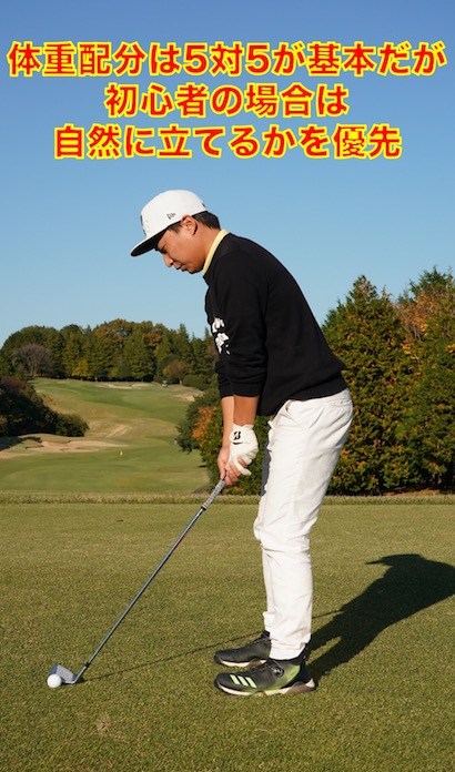 つま先やかかとに体重が寄っていても自分が自然体で立っていられれば無理に矯正する必要はないが、もしダフリが出る場合はかかと寄り、トップが出る場合はつま先寄りに調整してみよう。