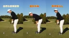 無理に前傾を作ろうとすると背中が丸まったり反ったりしやすい。①体の正面でグリップを握り、②③そこからクラブを自然に下ろせばかっこいい前傾姿勢になる。