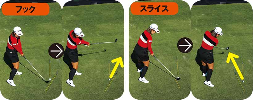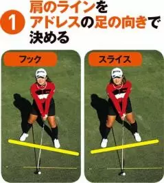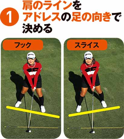 フックとスライスを使い分けるには、アドレスでしっかりと体の向きを決めること。肩のラインでスイングするイメージを持つと、ヘッドの軌道を操作しやすい。