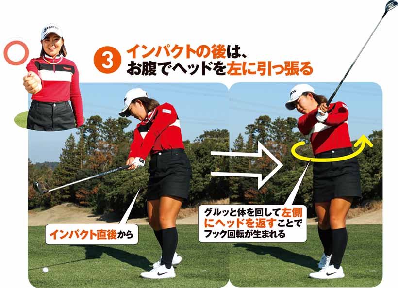 インパクト直後から、グルッと体を回して左側にヘッドを返すことでフック回転が生まれる。フックの場合、インサイドからアウトサイドに振ったクラブを、フォローで体ごと左側に引っ張ることで、球にはフック回転がかかる。