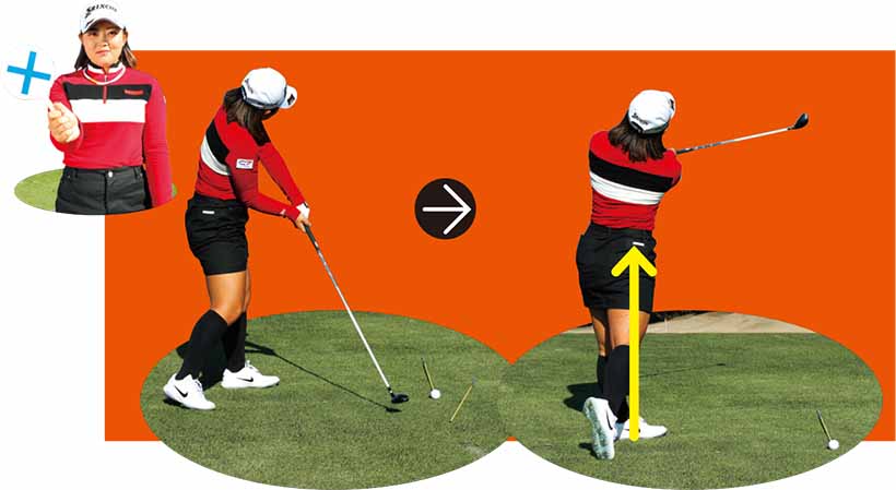 この時に体が起き上がってしまうと、フェースはそのまま開いたままになりスライス回転がかかってしまいます。なので、私はインパクト直後から思い切り体をグルッと左へ回すことによって、フェースを返します。体を横に回転させる意識を持つことで、上半身の起き上がりも防げます。