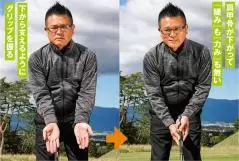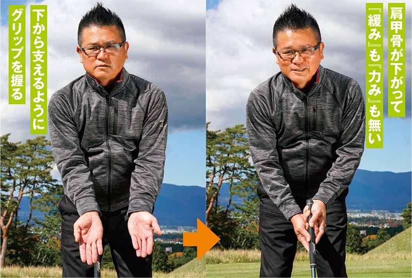 写真 左)アドレスで肩甲骨を下げるために、グリップをする時に下から握るようにする。
