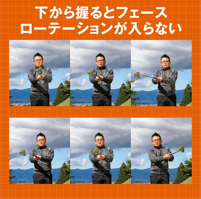 下から握ると、フェースローテーションが起きないので、ストローク中にフェースの向きが変わらない。