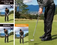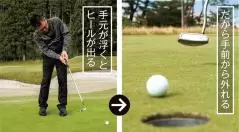 クラブを手のヒラに乗せて、パッティングのストロークをする。クラブが縦に動いていれば、インパクトで手元は浮かない。クラブが横に運くようなストロークは、インパクトで手元が浮いたりハンドファーストに入ってくるリスクがある。