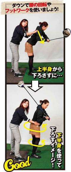 写真 右)ダウンでも下半身を回すことで飛距離が稼げます!