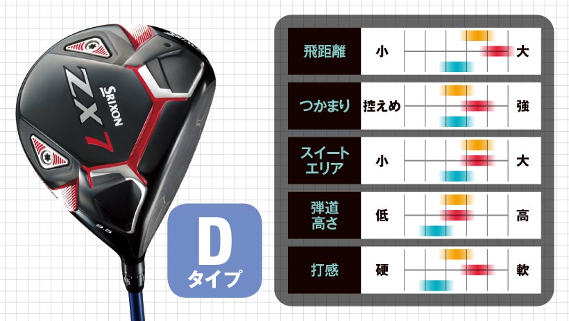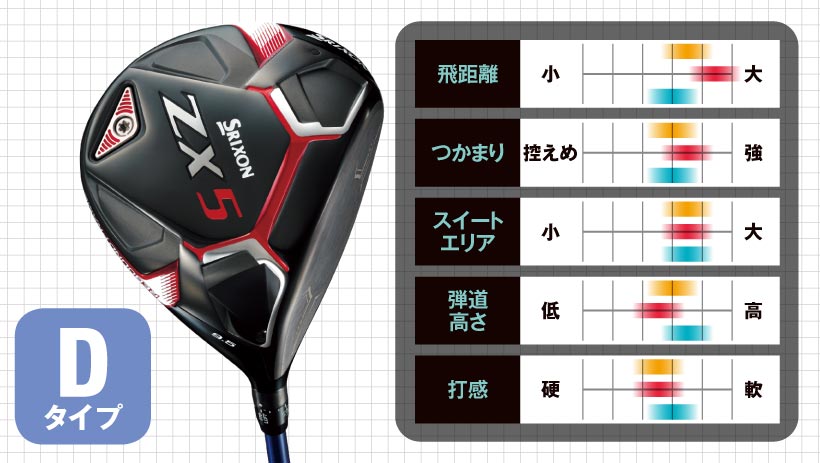 タイプ分析によるクラブの性格としては、どちらも球のつかまりは控えめのアスリート好みのゾーンにありますが、ZX5はヘッドの直進性が高いストレートボールを打ちやすいタイプ。ZX7はヘッドの操作性を持たせて球筋をコントロールしやすいタイプになっています。どちらも、重心角は大きくないので、自分で球をつかまえられる人向けになります。