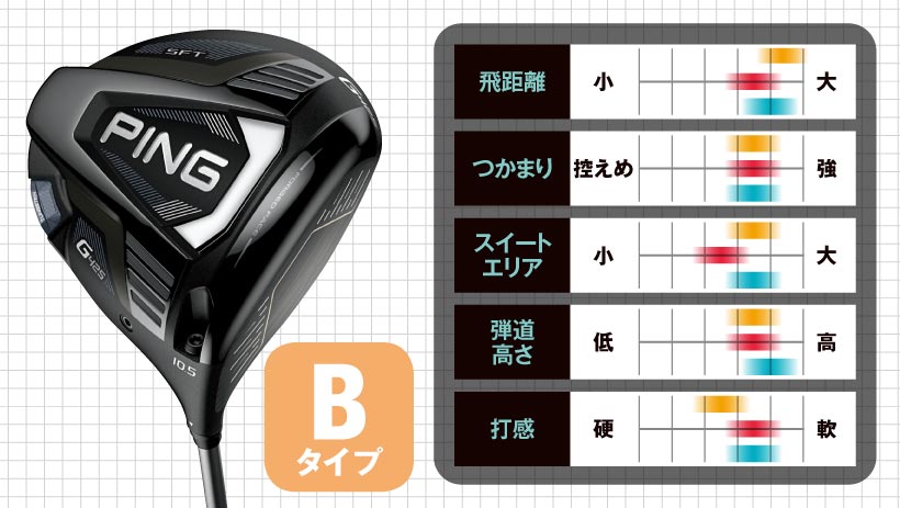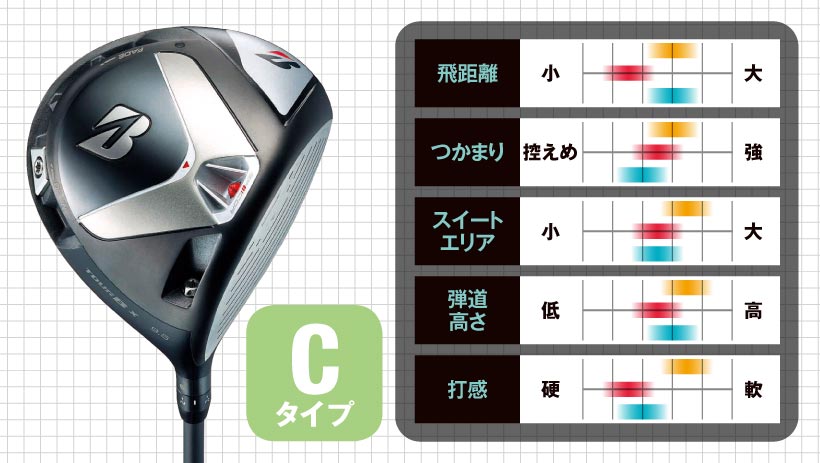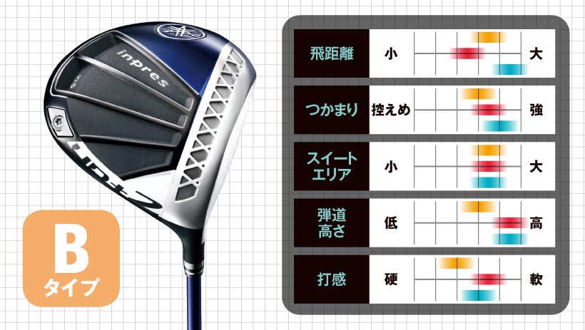 弾きの強さで初速が上がり、曲がりが少ないタイプです。インパクトでフェースが向いていた方向に真っすぐ飛んで行きます。球筋をコントロールするのではなく、ストレートボールで飛ばしたい人向きです。(高橋)
