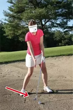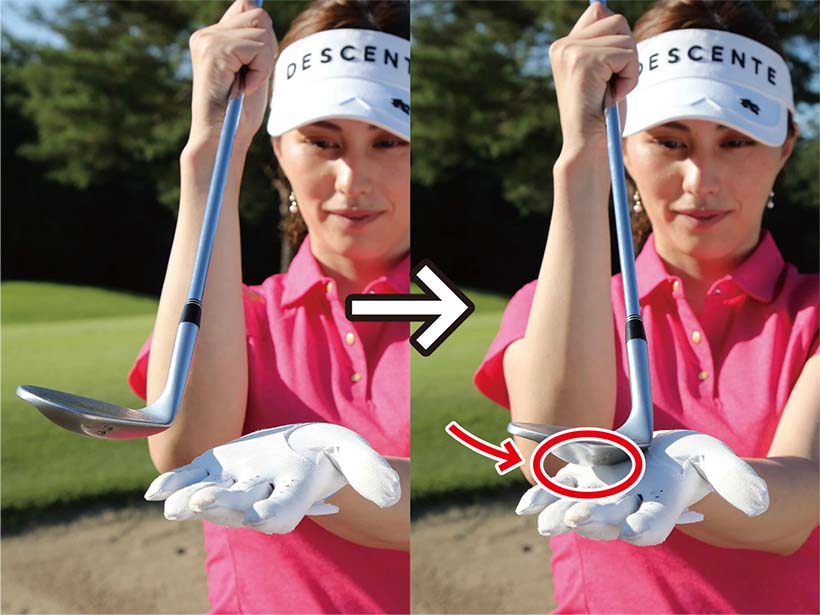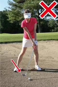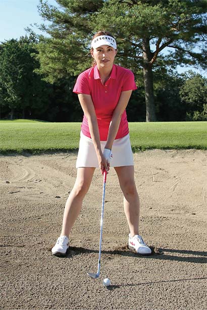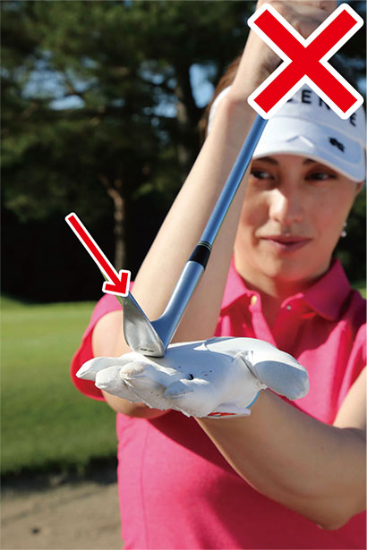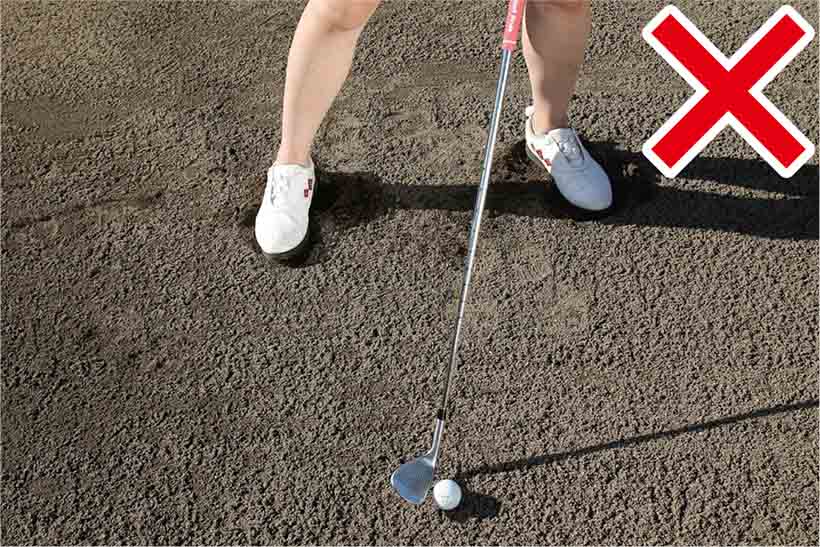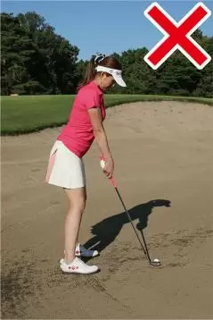アドレスでもう一つ注意したいのは、ハンドファーストに構えないこと。ドライバーやアイアンなどのショットでは軽くハンドファーストに構えて、ハンドファーストにボールをとらえるのが大原則ですが、バンカーショットにはそれが当てはまりません。