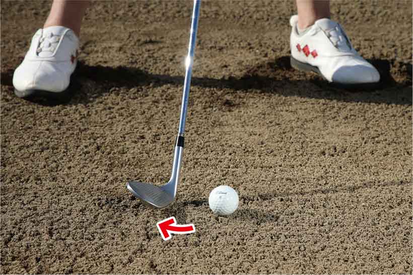 バンカーショットの場合、直接ボールはヒットしません。ボールの数センチ手前からクラブヘッドを入れて、ボールを周りの砂と一緒に飛ばすつもりでしっかり打ち抜くことが大切です。