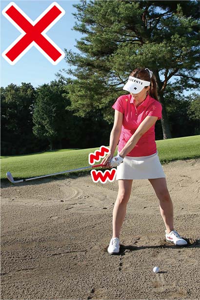 バックスイングではコックを早めに使ってクラブを立てていきます。コックを使いやすくするには、アドレスで手元を少し下げてややハンドダウンに構えるのがコツ。ボールの近くに立ってハンドアップに構えると手首が使いにくく、バンカーショットを難しくしてしまうので避けましょう。そしてバウンスで砂を叩くイメージでインパクト。クラブヘッドを加速させてフォロースルーへと向かえば、インパクトエリアでフェースターンが自然と行なわれて、ボールが周りの砂ごと飛んでいきます。