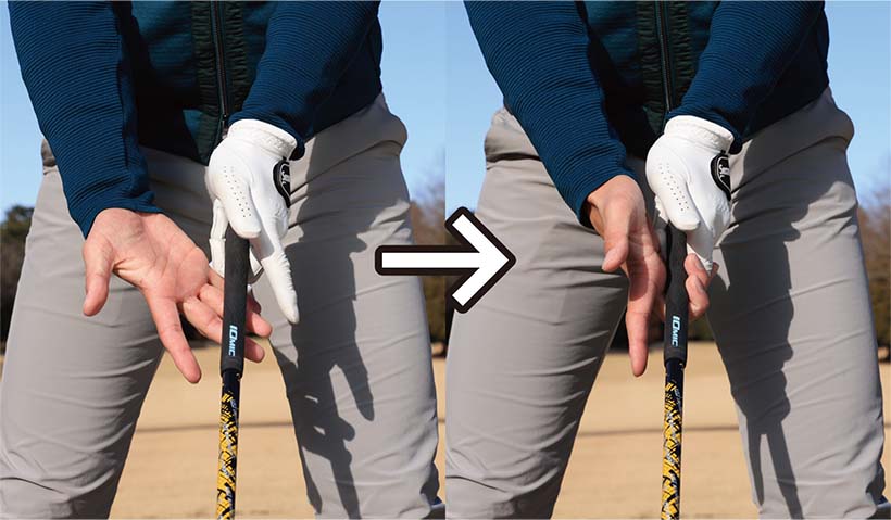 右手は中指と薬指の2本をグリップに巻きつけように握りましょう。そして左手甲の向きに合わせて右手を浅めに握ります。左手甲と右手のヒラの向きをそろえることで両手のバランスがよくなり、クラブの操作性がアップします。