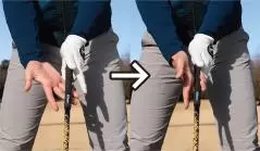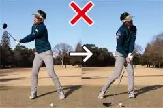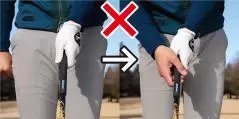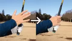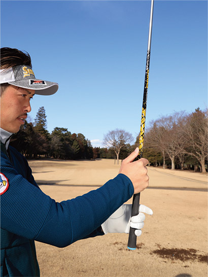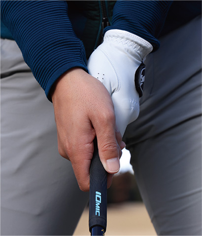 もう一つは、左手の人差し指、中指、薬指の3つのナックルが見えるくらいに左手の甲をかぶせること。ナックルが2つ見えるくらいでもOK。軽めのストロンググリップですが、このように握っておくとインパクトエリアで両手が返りすぎるのを防ぎやすく、フェースをスクエアに保ちやすくなります。
