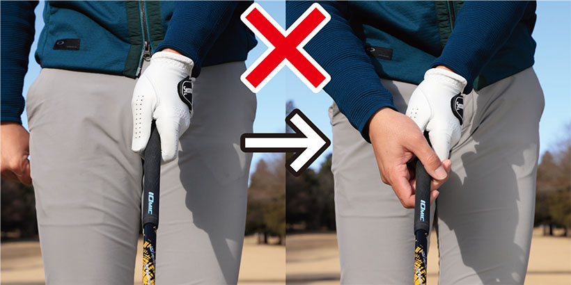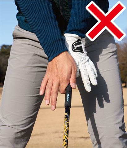 グリップを作るとき、ほとんどのゴルファーはクラブヘッドを地面につけた状態で左手から握ろうとします。これは間違いではないのですが、左ヒジを伸ばしてクラブを上から押さえつけるような体勢で握ることになりやすいので注意が必要です。左手の握りに違和感が生じやすく、「これでいいのかな? いや、こうかな?」という具合に、何となくしっくりこないと感じる人が多いのではないでしょうか。