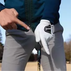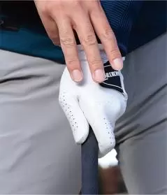 グリップは左手から握りましょう。左手の小指、薬指、中指の順でグリップを指で巻きつけるように握ります。手のヒラでグリップをつかむように握ってはいけません。あくまでも指で握る感覚を大事にしてください。このときのポイントはグリップエンドを2〜3センチ余して握ること。グリップエンドが手のヒラにかかるほどクラブを長く持つとグリップが安定しにくいので、クラブを短めに持つようにしましょう。