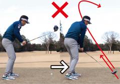 飛ばしたいと思うとクラブを思い切り振ろうとして、インパクトへの意識が薄れてミート率が低下してしまいます。インパクトでカラダが起き上がりやすい人は、アドレスの前傾角度をインパクトまでキープすることを心がけましょう。逆にインパクトで上体が突っ込んでしまいやすい人はクラブを目標よりも少し右にアウトサイドへと振り抜く意識を持ちましょう。インパクトで左の頬を壁に押し当てるイメージもいいと思います。クラブを右手で持ち、左手を左頬に当てて構え、左頬の位置が変わらないように右手素振りを数回繰り返します。そうするとカラダの無駄な動きを抑制し、ボールを真っすぐな軌道で打ち抜いていく感覚が明確に浮かんできます。