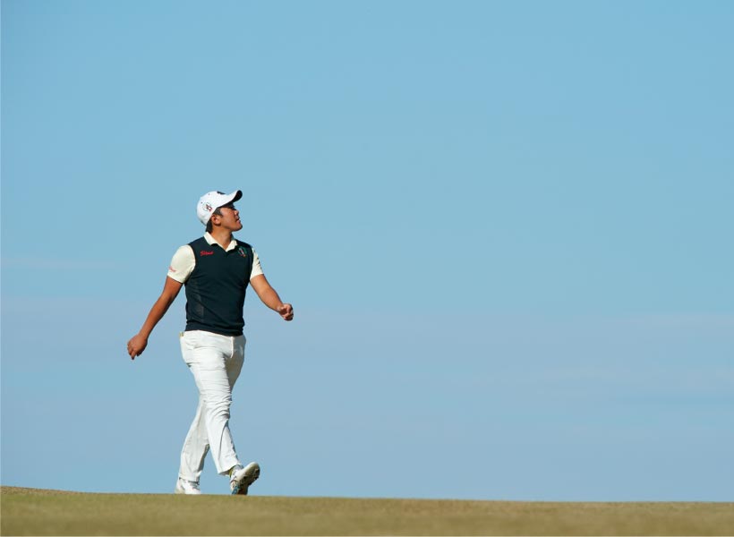 金谷 16番は320ヤード地点に木があるんです。確か風はフォローだったんですが、松山さんは3番ウッドでバシッと打ちました。木の手前まで行くのかな?と思ったらカーンって木に当たったんですよ。衝撃的でした。なんじゃそれ?って思いました(笑)。そもそも最初から松山さんとラウンドすること自体、緊張していたのに、初日の前半(10番スタート)であんな強烈なショットを見せられて、どうすればいいのかわからなくなりました。頭のなかはごちゃごちゃで、これから自分はこの世界でやっていけるんだろうか?とか余計なことを考えてしまってまったくプレーに集中できなくなりました。で、ガタガタと崩れてしまった。その経験から人のプレーに惑わされず自分がやるべきことに集中しよう、と思うようになりました。