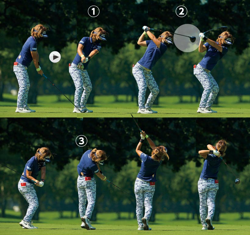 テレサ・ルーはボールを横から払い打つようなスイングで、とても効率のいいインパクトを実現しています。その秘訣はスイング中にカラダの軸が右にも左にも傾かないこと。アドレスで軸をなるべく真っすぐにキープし、コマのようにカラダをよどみなく回転させればミート率が向上するのです。