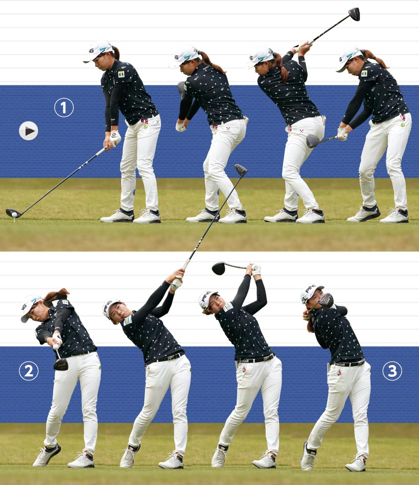 比嘉真美子は右手もそうですが、左手を内側に絞り込むように握っておいてクラブを思い切り引っ張り下ろしています。カラダの左サイドでクラブを引っ張るからボールを思いきり叩けるという見本のようなスイング。左手を重視したい人の参考となるでしょう。