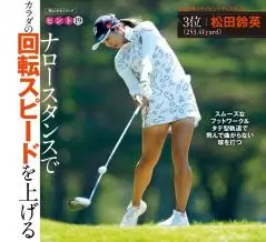 松田鈴英はスタンスが狭くて、回転の力を強く使ったスイングです。スタンスが狭いと左右の動きが少ない反面、カラダの回転スピードを上げやすい。さらに長身の体型的長所を生かしてアップライトにスイングしています。タテ型の軌道で振ればインパクトゾーンが長くなり、タテ回転のスピンをかけやすくて曲がり幅を軽減できます。